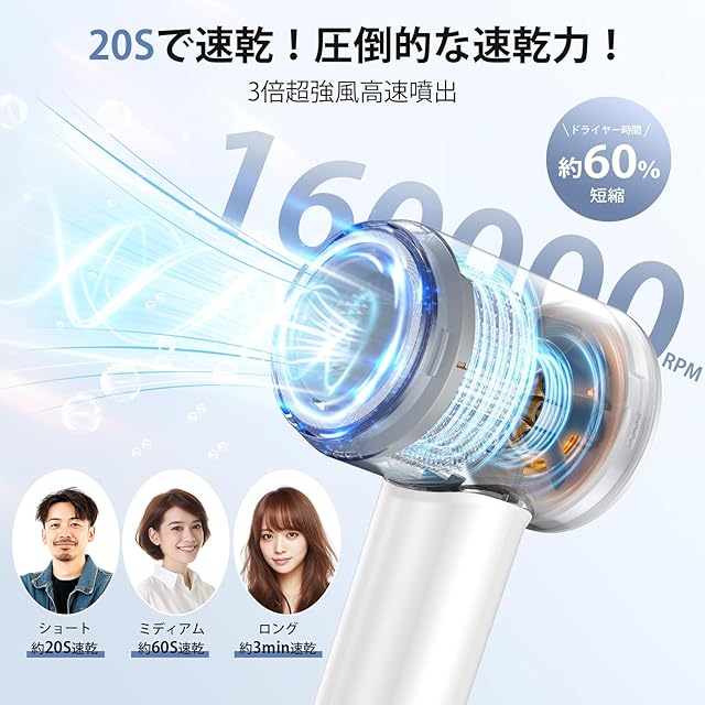 【史上最速!20sで速乾!65%時間短縮を実現!】「速乾・美髪・光沢・保湿・ヘアケア・髪質改善」などヘアドライヤーに対するすべての期待を同時に叶える美髪速乾ドライヤーが誕生!160,000rpmの超高速ブラシレスモーターを採用し、技術革新による新たな送風方法で65m/s圧倒的な大風速&8m³/分の史上最大風量を実現!!従来品ドライヤーより約65%のドライ時間を短縮し、ドライ時の熱ダメージを回避できる髪に優しい大風量ドライヤー !さらに、従来の乾かし方を一新し、高温に頼らず大風速で髪の根元から素早く乾かすため、リアル低温風乾を実現!過度な熱から髪を守りましょう!このドライヤーは抜群の速乾性を持ち、忙しい朝でも効率的に!