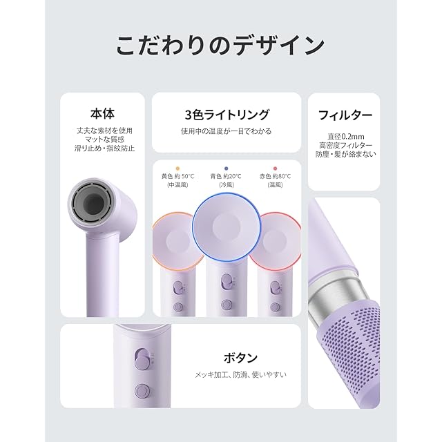 大風量で素早く乾燥:高速10.5万回転/分のブラシレスモーターを搭載し、風速は最大21m/秒まで達します。力強い風で髪を素早く乾かし、より多くの自由時間を楽しむことができます。あなたの髪を健康的で自然な輝きへと導きます。乾燥した髪とはさよなら、潤いと滑らかさのある髪へ。