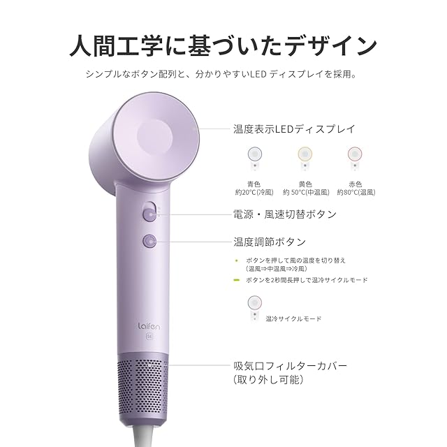 スマートな温度制御、過熱防止機能:内蔵のマイクロプロセッサーとスマートチップ、50回/秒の定温アルゴリズムにより、風口温度をリアルタイムで監視。温度を微調整し、過熱を防止します。高温による髪のダメージを避け、髪を守ります。(注意:Laifenヘアドライヤーには電気フィルターが搭載されています。これにより、電圧の安定化と回路干渉の防止が可能です。)