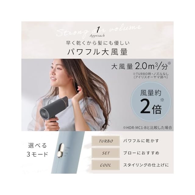 【大風量2.0m³/分】大風量の2.0m³/分でアイリスオーヤマのHDR-MC1-Bのドライヤーと比べると風量が約2倍になります。(※TURBO時・ノズルなし・アイリスオーヤマ調べ)パワフルな風量で早く乾くから髪へのダメージを減らします。【低温でダメージを抑えながら乾かす】本製品は温風のTURBO時の温度は約50℃です。低めの温度でダメージを抑えながらも大風量で早く乾かすことができます。