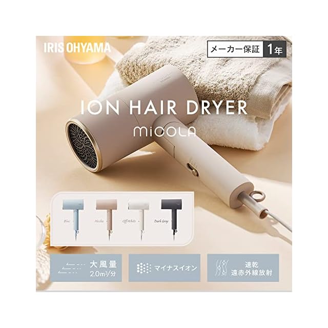【MiCOLA】毎日のケアをもっと私らしく、もっとポジティブに。そんな思いから生まれた「MiCOLA」は/まだ初々しい髪や肌をいたわりながらあなただけの個性を引き出すお手伝いするブランドです。自分らしさの初めての一歩を踏み出したあなたに、カラフルなエールを送ります。【カラーバリエーション】本製品はダークグレー/オフホワイト/モカ/ブルー/の4つのカラー展開です。カラーだけでなく、マットな質感でインテリアに馴染むおしゃれなドライヤーです。【商品詳細】■風量:2.0m³/分(TURBO時・ノズルなし・アイリスオーヤマ調べ)■質量:約515g ■電源コードの長さ:約1.8m ■温風:約50℃(TURRBO・ノズルあり・室温30°のとき) ■定格電源:AC100V、50/60Hz/■定格消費電力:1200w(TURBO) ■付属品:取扱説明書、ノズル ■マイナスイオン ■遠赤外線放射