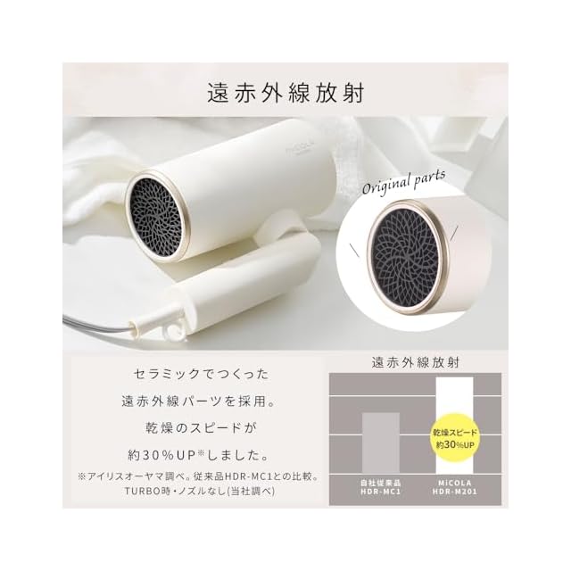 アイリスオーヤマ MiCOLA (ミコラ) ドライヤー 遠赤外線搭載 速乾 大風量 イオンドライヤー アタッチメント付き HDR-M201-W オフホワイト