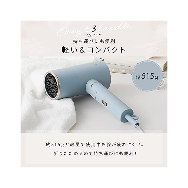 【軽い&コンパクト】持ち運びにも便利な軽くてコンパクトなドライヤーです。重さは約515gで500mlのペットボトルほどの軽さ。ドライヤーの重さによる使用中のストレスを軽減します。さらに使用しないときはコンパクトに収納できます。また旅行の持ち運びにも最適です。