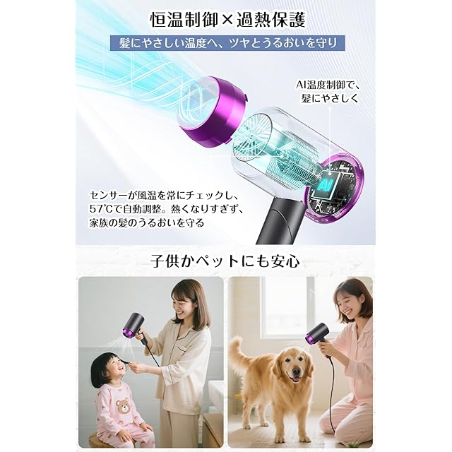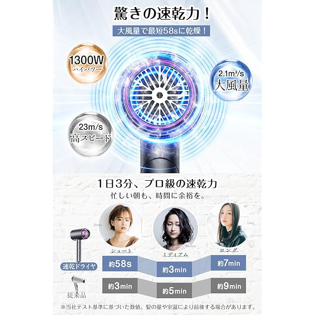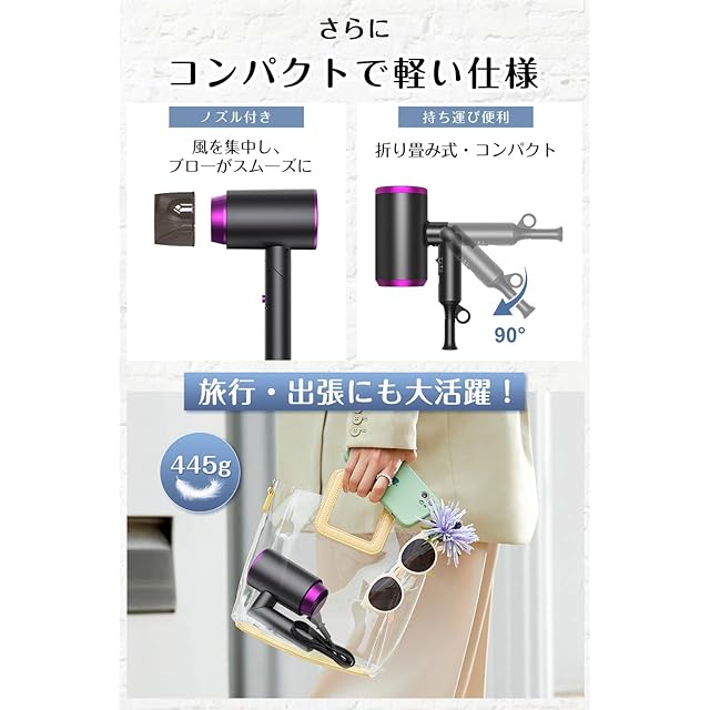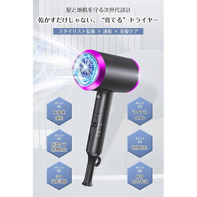 ①【ドライヤー 速乾 大風量・57℃恒温で髪にやさしく速乾】 最新の ドライヤー 速乾 大風量 は、プロ仕様のモーターを搭載し、強力な風量で髪を素早く乾かします。さらに57℃の恒温設計で熱ダメージを抑えながら、髪にやさしく速乾。梅雨時や夏の汗ばむ時期でも快適に使用でき、ロングヘアでも短時間でしっかり乾燥。家庭用だけでなく、出張や旅行用の 小型コンパクト ヘアドライヤー としても便利です。