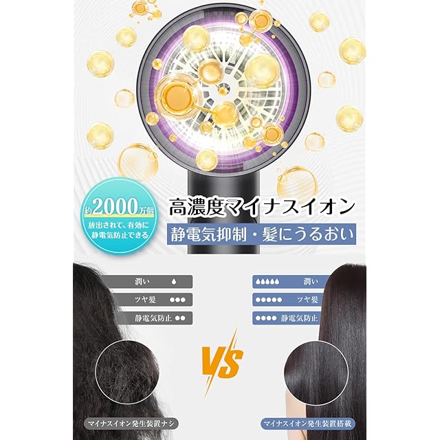 ③【高濃度マイナスイオン搭載・静電気を抑えてなめらかな髪へ】 高濃度マイナスイオンを発生させる マイナスイオンドライヤー 仕様で、髪のパサつきを防ぎながらしっとりまとまる仕上がりを実現。冬場の乾燥による静電気を抑え、まとまりのある髪に。速乾ドライヤー 大風量 マイナスイオン は、髪の美しさを維持したい方におすすめの一台です。