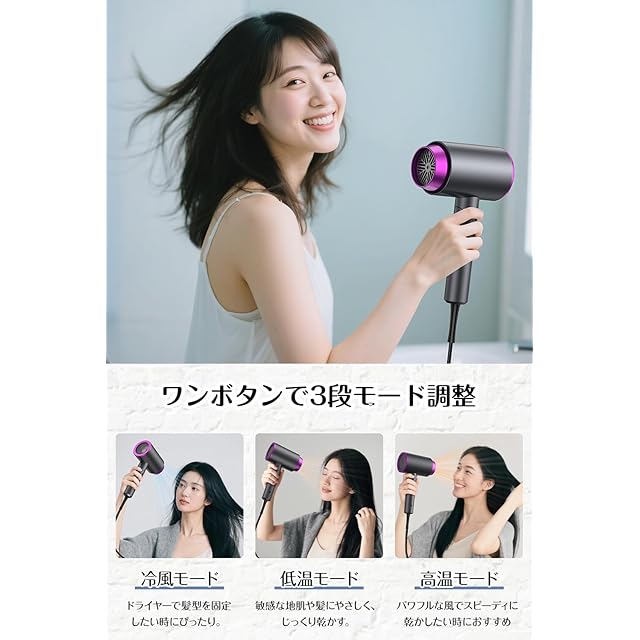 ④【3段階風量調節・低騒音設計で快適使用】 3段階の風量モード(強風・中風・弱風)を搭載し、髪質やシーンに合わせた使い分けが可能。深夜や早朝の使用でも周囲を気にせず使える 低騒音設計。折り畳み式 コンパクト ドライヤー なので、旅行やジム、出張にも最適で持ち運びも簡単。収納場所を選ばず、省スペース設計で日常生活をさらに快適にします。