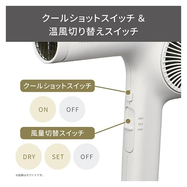 ミニマムな機能でヘアドライを快適にします。 温風と冷風をワンタッチで切り替えるクールショットスイッチは、 グリップを握ったときに押しやすい位置に設定。 風量切替スイッチもシンプルな操作性。