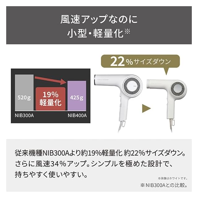 当社従来機種より約22%(※)の小型化と約19%(※)の軽量化を実現。 大幅に軽量・小型化しながらも風速は34%(※)アップ。 持ちやすく乾かしやすい、軽量ドライヤーです。 ※NIB300Aとの比較