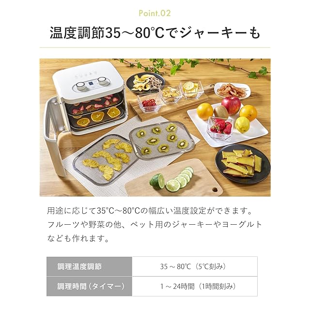35~80℃の温度設定ができ、ヨーグルトからジャーキーまで作れます。