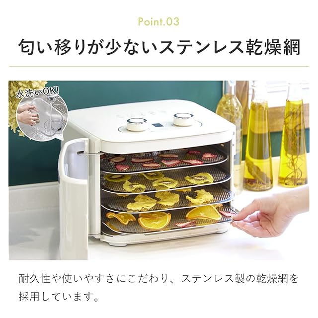 金属製の乾燥網は丈夫で匂い残りしにくく、お手入れ簡単。ジャーキーも安心して作れます。