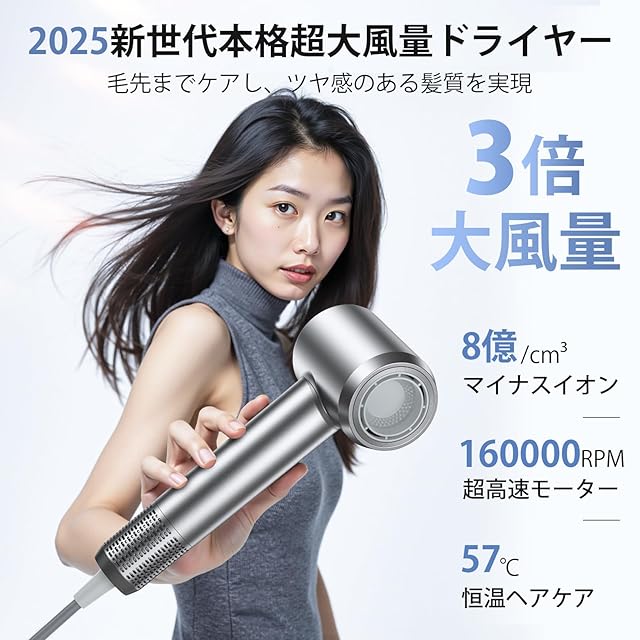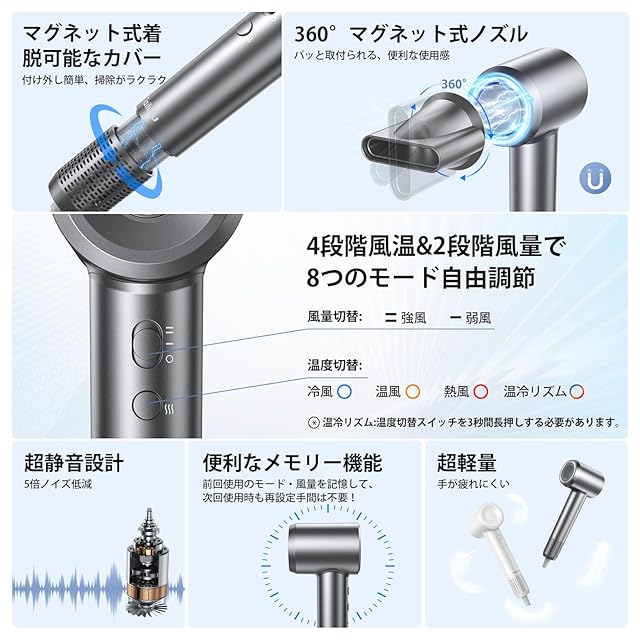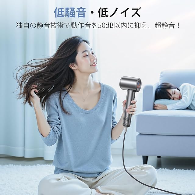 【8億超高浸透マイナスイオン・髪質改善】あなたの髪を一日中サラサラで美しく保つ秘密が、このヘアドライヤーには内蔵されています!①特許取得済みの【8億個の超高浸透・高濃度マイナスイオン】発生装置 →水分がキューティクルのわずかな間へ浸透。さらに静電気を抑制し、髪の乾燥と切れ毛を防ぎます。髪のツヤとまとまりを実感できます!②【AIマート温度制御・恒温ヘアケア】→安定な送風温度を制御し、頭皮と髪にダブルケア、髪の光沢を保つ③過熱防止システム→過熱を防ぎ、髪への熱ダメージを防ぐ!④温冷リズムモード→髪表面が熱くなりすぎる前に冷ますことができ、髪のうねりや広がりを抑えてまとまりのある髪と、ツヤ感がさらにアップ!あなたの髪は、常に潤いと輝きにあふれ、まるでプロの美容師が手入れしたような仕上がりになります。速乾x美髪を両立したヘアドライヤーです。