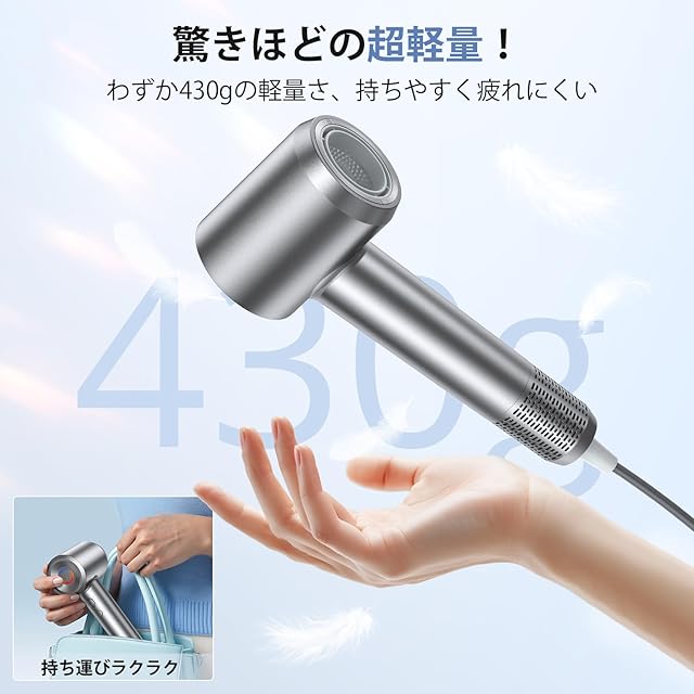 【超軽量&低騒音】このドライヤーは独自の静音技術で、空気の集中力を高め、風量を増加させると同時に動作音を50dB以内に抑え、超静音!新しい設計により小型化&超軽量化を実現。約430g(コードとノズルなし)の驚きの軽さで、長時間持っても疲れにくく、美容師にも好評です。コンパクトなサイズで場所を取らず、旅行や出張にも最適な持ち運びが可能です。【AIマート温度制御&二重安全保護機能】このヘアドライヤーはNTC温度検知チップとAI温度制御二重検知機能により、毎秒100回の温度検知して安定した温度をキープします。さらに、温度過昇防止装置も内部に配置され、安全・安心にお使いいただけます。