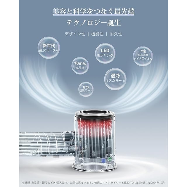 商品名:【美人百花掲載】【人気雑誌Poco'ce掲載 】速乾ドライヤー 【20S速乾・2025サロン級の爆風】 TOPZEE 大風量 速乾 ドライヤー 70m/s ヘアドライヤー 1300W 超高速BLDCモーター 7億超高濃度マイナスイオン 静電気抑制 温冷リズム搭載 8つモード メモリー機能 低温 軽量 静音 ドライヤー NTC温度制御 5つ安全保護 家庭用 360°回転磁吸ノズル 誕生日 プレゼント PSE認証済み