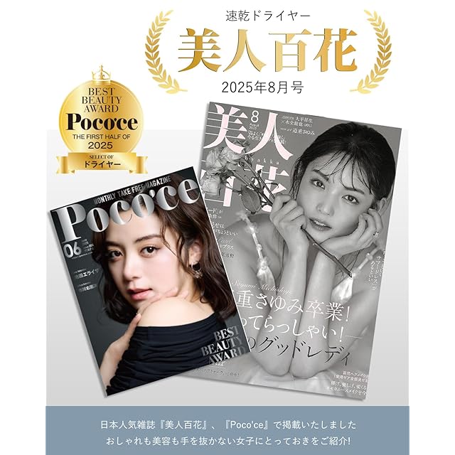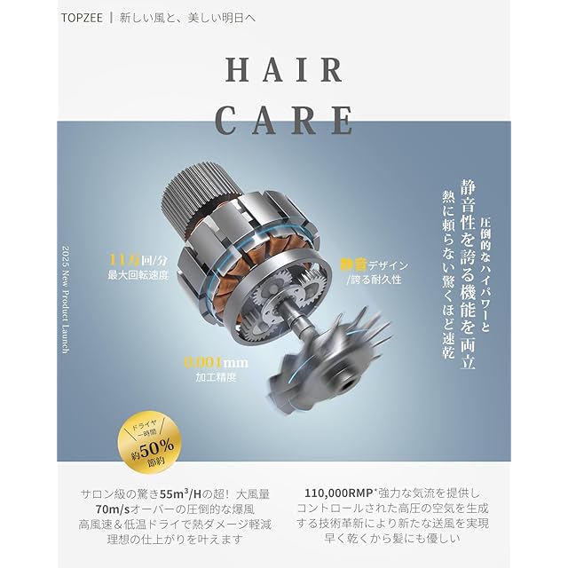 【美人百花「2025年8月号」掲載】【人気女性誌Poco'ce「2025年7月号」掲載 】おしゃれも美容も手を抜かない女子にとっておきをご紹介!【美容家電の新基準!驚異の20 sドライ 速乾×美髪║サロン級の爆風力で髪を守る新次元速乾ドライヤー】 Topzeeが挑戦したのは「速乾」と「美髪」の両立。◎「軽量 速乾 ドライヤー」の常識を超えた革命を起こす新世代の超高速BLDCモーターが搭載だからこそ、圧倒的なハイパワーと静音性を誇る究極の大風量 ドライヤー。航空機エンジン流体力学を応用した風路設計により、髪の表面温度を制御しながら、サロン仕様の強風を実現。11万RPMの超高速モーターと70m/sの強力気流の融合により達成!厚い髪も3分で芯まで素早く乾燥。高温によるダメージを抑えながら、髪のキューティクルを保護する「低温速乾」を実現