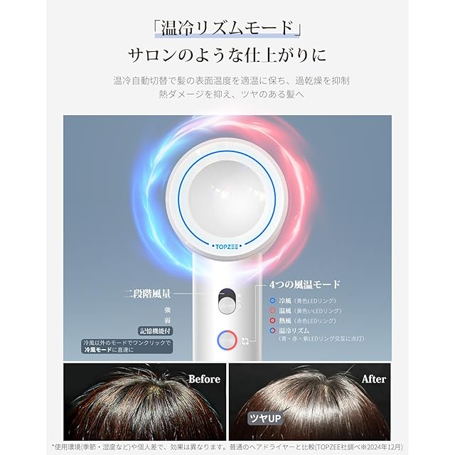 【美髪工学の進化║うるツヤ髪必見・業界革新の美髪ドライヤーが登場!】 ✅ Topzeeの高濃度イオン発生技術が、7億のマイナスイオンを髪全体に包み込み、髪のまとまりを良くし、しなやかさを実現!毛先から根元まで栄養を与え、髪のダメージを修復・保護し、静電気を抑えます、髪に自然な輝きと弾力を与えます。「くせ毛対策」「艶髪ケア」を求める女性に支持されています。✅ 温風と冷風を自動で切り替えて「温冷リズムモード」で髪の表面温度を適温に保ち、過乾燥を抑制し、頭皮と毛先を正しく乾かします。Topzee 速乾ドライヤー がサロン級のブローを自宅でも艶髪の近道は温度管理に!過度な熱から髪を守りながら、理想の仕上がりを叶えます。◎「朝の忙しい時間も、夜の入浴後も、時短美容で自分時間を増やせる」と主婦層から絶賭