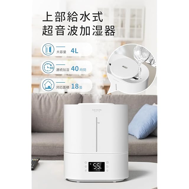 ASAKUKI 加湿器 大容量4L 超音波式 アロマ対応 自動湿度調整 40時間連続稼働 上から給水 静音 タイマー 睡眠モード ナイトライト 空焚き防止 ミスト量3段階 加湿量最大200ml/h 18畳対応 リモコン付き 寝室用