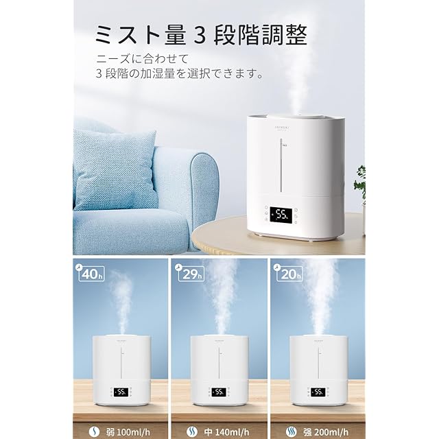 【ワンボタンで自動湿度調整】ASAKUKI超音波加湿器は、湿度センサーを搭載しており、お部屋の湿度を自動でコントロールできます。通常の湿度設定モードに加え、新たに自動モードを追加しました。ワンボタン操作で、湿度を40%〜60%に保つことができるため、非常に簡単で便利です。また、睡眠モードには自動湿度調整機能も備わっており、昼夜を問わず過湿になる心配がありません。