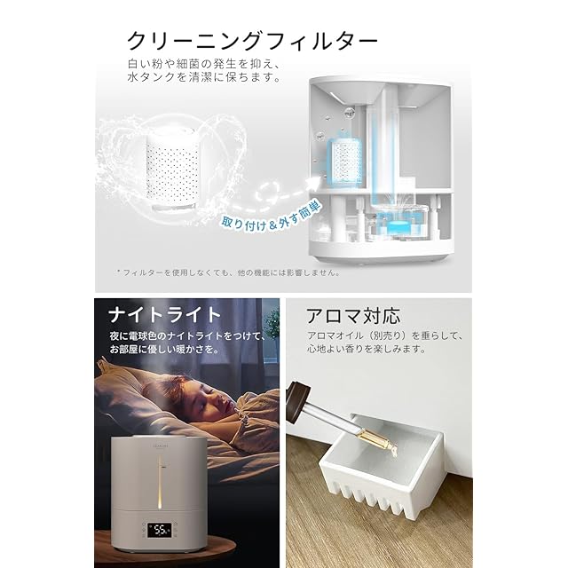 【多機能加湿器】ASAKUKI卓上加湿器は、さまざまなニーズに応える多彩な機能を搭載しています。空焚き防止機能やタイマー機能を完備し、安全性と利便性を両立。寒い夜には電球色のナイトライトが心地よい暖かさを提供し、リラックスしたい時にはアロマの香りで癒しの空間を演出します。さらに、フィルター付きで白い粉の発生や細菌の繁殖をしっかり抑え、清潔なミストをお届けします。