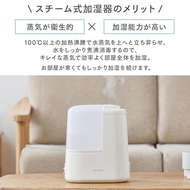 ◆清潔にしっかり加湿。【蒸気が衛生的】×【加湿能力が高い】。100℃以上の加熱沸騰で水蒸気を上へと立ち昇らせ、水をしっかり煮沸消毒するのできれいな蒸気で効率よく部屋全体を加湿します。
