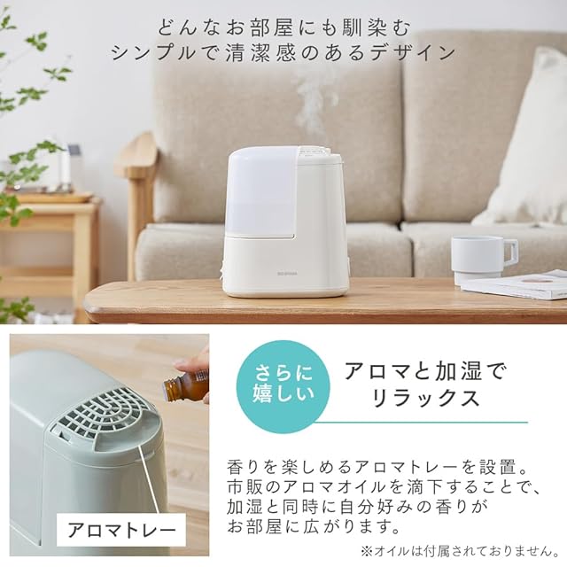 コンパクト×清潔加湿。アロマ対応のスチーム式加湿器です。