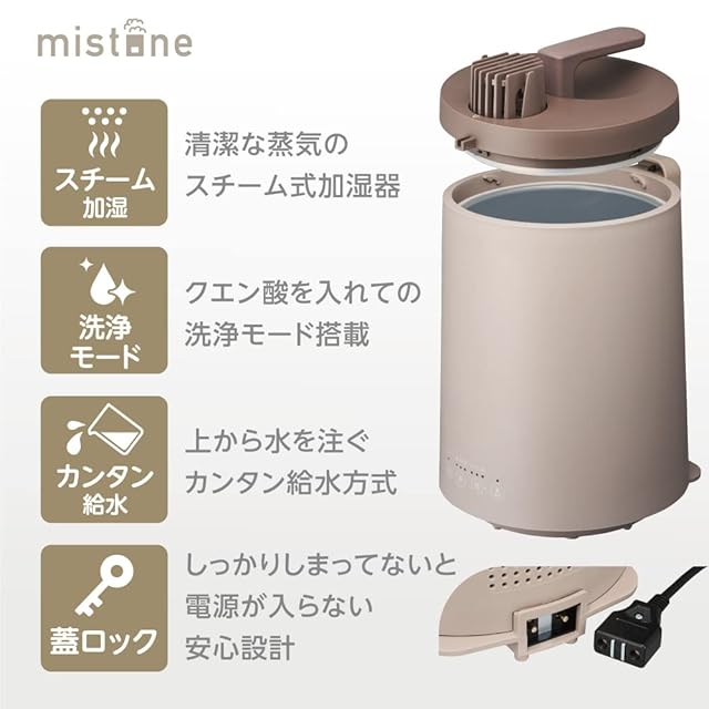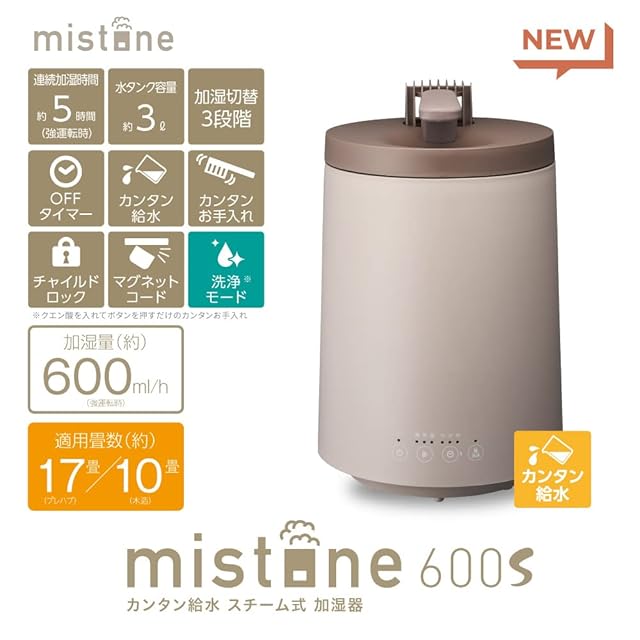 ドウシシャ 加湿器 スチーム式 加熱式 上から給水 スモークブラウン 抗菌加工 大容量 洗浄モード付き 連続加湿時間5時間 プレハブ洋室17畳/木造和室10畳 mistone600s