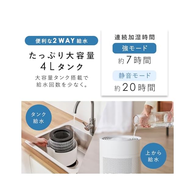 【2WAY給水】カンタン上から給水:上ぶたを開けてコップなどで、上から給水。/水タンクを外して給水:上ぶたを開けて、水タンクを取り外して給水。