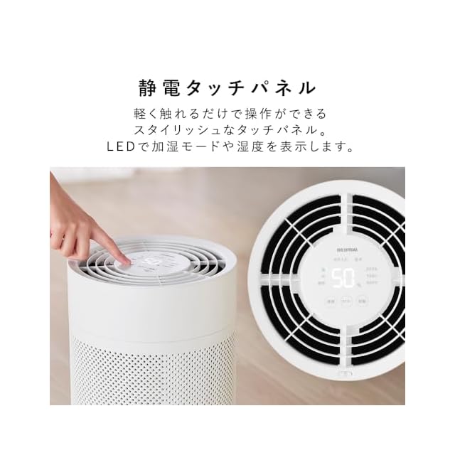 【かんたん操作パネル】シンプルなパネルでわかりやすい。モードやタイマーは、ボタンを押すたびにモードが切り替わるだけなので操作もラクラク。[自動モード(50/60/70%):設定した湿度を保つように、自動的に加湿量を調整して運転。][連続モード(弱/中/強):湿度センサーの状態にかかわらず、設定した出力で連続運転。][切タイマー(2/4h、消灯でタイマー解除):設定した時間に運転を停止、自動的に電源をOFFに。]