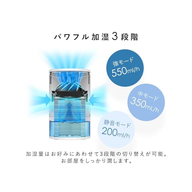 POINT4 パワフル加湿3段階。加湿量は3段階。静音/中/強