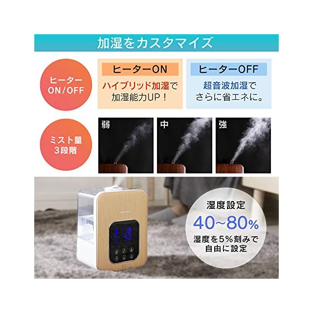 超音波式+加熱式を組み合わせたハイブリッドタイプの加湿器。ヒーターで温めた水を超音波の力で微粒子化。やわらかミストでたっぷり加湿。デジタル表示で加湿が「見える」!ミスト量や湿度も一目でわかります。おやすみモード搭載で、電源・おやすみ表示・タンク照明以外を消灯します。