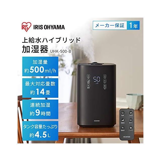 アイリスオーヤマ 加湿器 大容量 超音波式 スチーム式(加熱式) ハイブリット式 加湿量 500ml タンク容量 4.5L 14畳 9時間連続加湿 アロマ対応 上から給水 タッチパネル チャイルドロック おやすみモード リモコン付き 小型 卓上 デスク用 UHK-500-B ブラック