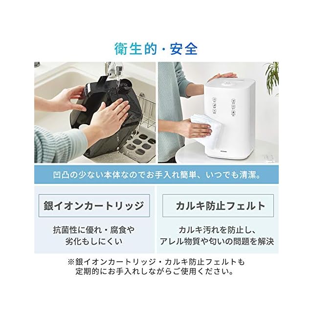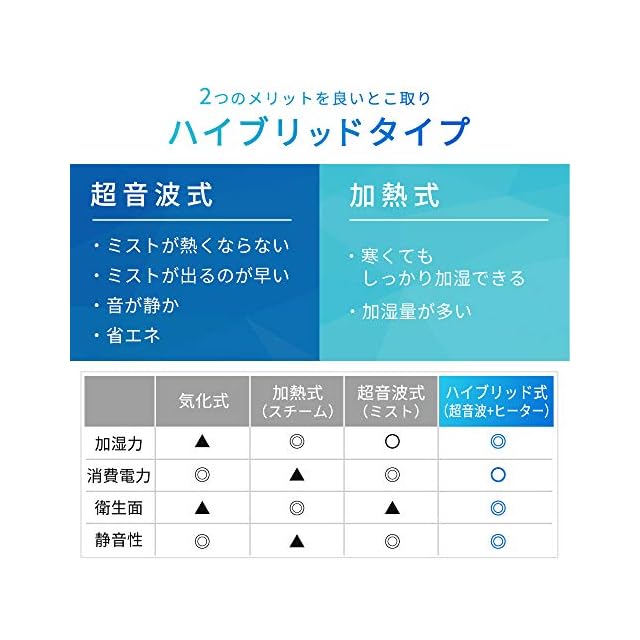 ・安心・清潔なハイブリッド式(超音波式+加熱式)なので、水や吹き出し口が熱くなることもなく、小さなお子様のいるご家庭でも安心です。