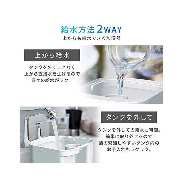・ふたを外して上から直接水を注ぐことも、タンクを外して水道まで持って行って給水することも可能な2WAYタイプです。タンクには持ち手がついているので、持ち運びも楽々です。