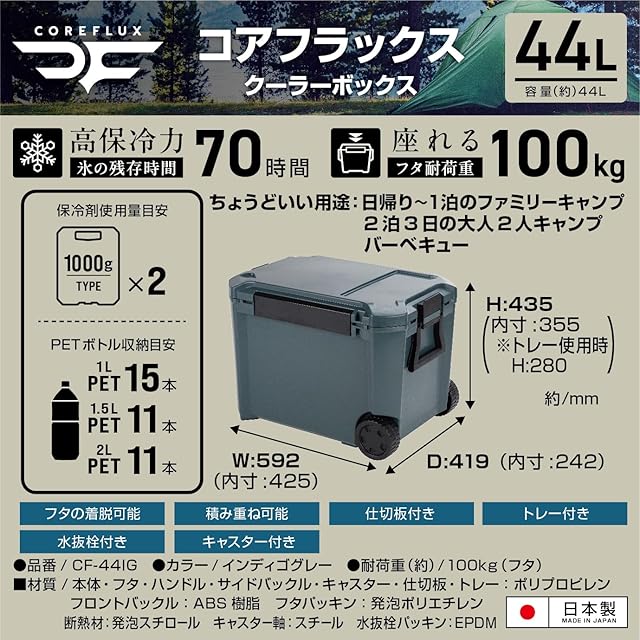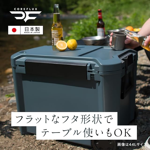 JEJアステージ 座れる 高保冷力 クーラーボックス COREFLUX (コアフラックス) インディゴグレー 44L 日本製[幅592×奥行419×高さ435mm]レジャー スポーツ 部活 アウトドア 鍵穴付き ピクニック 水抜き栓 仕切板 トレー付き 蓋が外せてお手入れ簡単