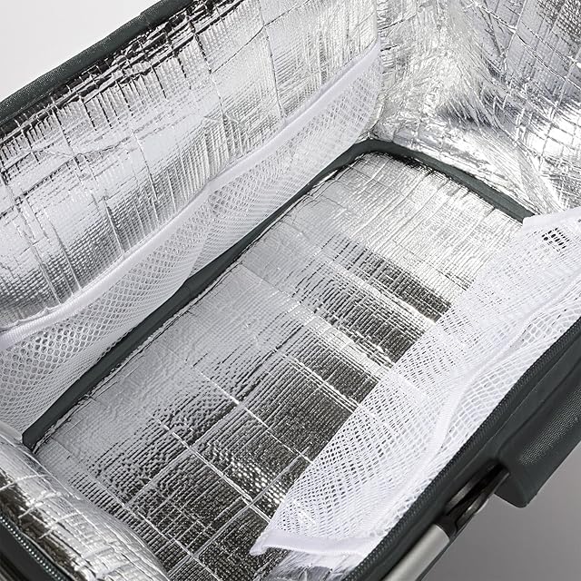 素材:【本体】表地/ポリエステル、裏地/アルミ蒸着シート、フレーム/アルミ、ハンドルグリップ/EVA樹脂、フレーム連結部分/ポリプロピレン【外袋】ポリエステル(内側芯材クッション材、EVA発砲樹脂)