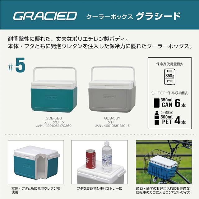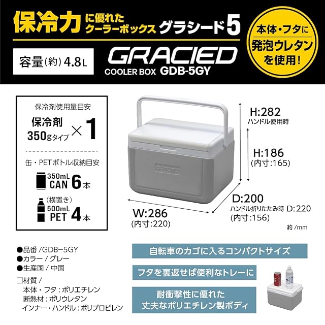 JEJアステージ 使いやすい小型 クーラーボックス グラシード5 グレー 4.8L [幅286x奥行220x高さ186mm] レジャー スポーツ 部活 アウトドア キャンプ ピクニック 保冷 お弁当 自転車のカゴに入れる コンパクト 軽量 釣り 小型 350缶6本