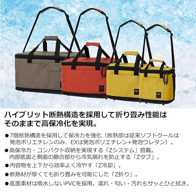 7層断熱構造を採用して保冷力を強化(断熱部は従来ソフトクールは発泡ポリエチレンのみ、EXは発泡ポリエチレン+発泡ウレタン)。 用途に合わせて選べる4サイズ、各3色展開。