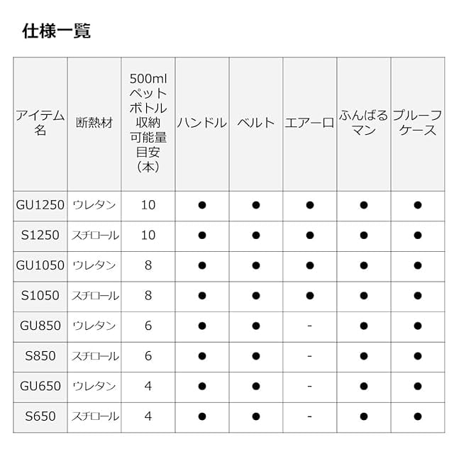 サンドイッチやオニギリを濡らさず収納できるプルーフケース付/ペットボトル600mlが縦置き収納可能、12.5L最大10本、最大10.5L:最大8本、8.5L:最大6本、6.5L:最大4本(6.5Lは横置き)/持ちやすいロングハンドルと肩ベルトが標準装備/取り外し可能でお手入れ簡単な両開き上フタ/安心して座れる頑丈ボディ、上フタが平らで座りやすい/底面には滑りにくいふんばるマン付き/φ6エアーチューブを通せるエアー穴付き(12.5L、10.5L)/.自転車の前カゴに入れやすいサイズ設計(8.5L、6.5L)