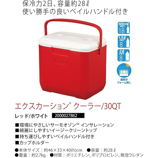 Coleman(コールマン) クーラーボックス エクスカーションクーラー 30QT 容量約28L レッド/ホワイト 2000027862 アウトドア キャンプ 保冷2日 部活 釣り 28L 防災 ピクニック