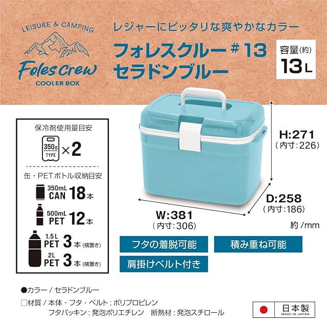 JEJアステージ フタが外せてお手入れ簡単 クーラーボックス フォレスクルー セラドンブルー 13L 日本製[幅381x奥行258x高さ271㎜]レジャー スポーツ 部活 アウトドア キャンプ ピクニック 保冷 お弁当 コンパクト 軽量 釣り 500ml ペットボトルを立てて収納できる ショルダーベルト付