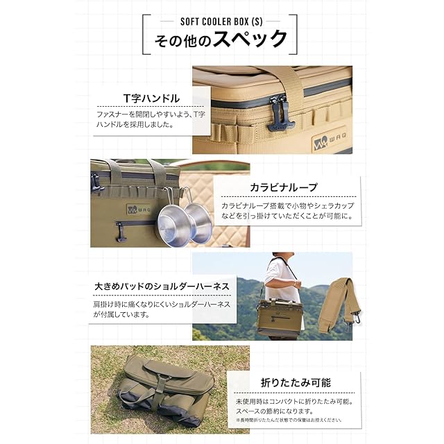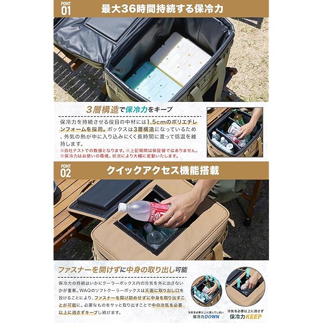 ✔【用途によって選べる2サイズ展開】Sサイズは1〜2人ぐらいまでのキャンプに最適な容量35L。食材や飲み物のスペースを分けるときに内部を区切るための仕切り板が2枚付属。食材や飲み物のスペースを区切るときにご活用ください。【クイックアクセス機能搭載】保冷力の持続はいかにクーラーボックス内の冷気を外に出さないかが重要。WAQのソフトクーラーボックスは天面に取り出し口を設けることにより、ファスナーを開け閉めせずに中身を取り出すことが可能に。必要なものをサッと取り出すことで中の冷気を必要以上に逃さずキープし続けます。