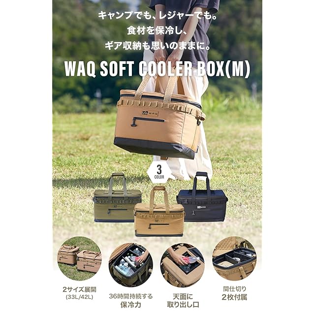 ✔【用途によって選べる2サイズ展開】Sサイズは1〜2人ぐらいまでのキャンプに最適な容量33L。食材や飲み物のスペースを分けるときに内部を区切るための仕切り板が2枚付属。Mサイズはファミリーキャンプに最適な42Lの大きさ。Sサイズと同じく仕切り板が2枚付属しているため食材や飲み物のスペースを区切るときにご活用ください。【クイックアクセス機能搭載】保冷力の持続はいかにクーラーボックス内の冷気を外に出さないかが重要。WAQのソフトクーラーボックスは天面に取り出し口を設けることにより、ファスナーを開け閉めせずに中身を取り出すことが可能に。必要なものをサッと取り出すことで中の冷気を必要以上に逃さずキープし続けます。