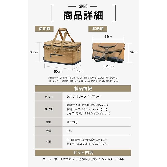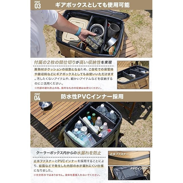 ✔【ギアボックスとしても使用可能】断熱材がクッションの役割となるため、ご自宅での保管時や撤収時などにギアボックスとしてもお使いいただけます。汚したくないアイテムや、細かいアイテムなどを収納するのにご活用ください。※内部の破れ防止の為、鋭利なものの収納はお控えください。【防水性PVCインナーを採用】止水ファスナーとPVCインナーを採用することにより結露などで発生した内部の水が漏れにくい仕様になりました。※完全防水ではございません。液体を直接入れないでください。