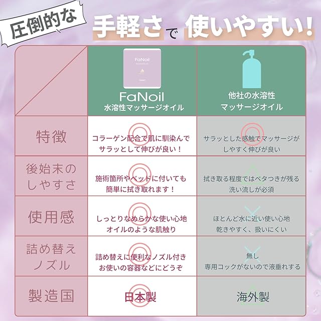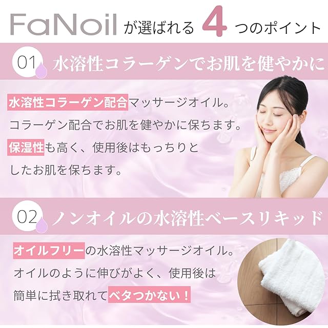 拭き取り簡単!コラーゲン配合の水溶性マッサージオイル!水溶性コラーゲン配合で、お肌を健やかに保ちます。化粧品基準の原料のみを使用しています。
