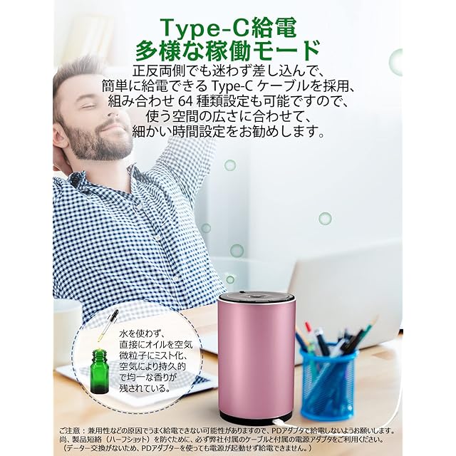 【1.5mケーブルと広い空間対応】お客様からの意見を分析し、本来の1mのケーブルを余裕がある1.5mに変更し、それに汎用性が高いTYPE-C USB コードを付属しました。利便性と汎用性をいつも考慮し、いかなるお客様の利用環境も対応できるように心かけています。特製のポンプにより強い出力を有するとともに、常にアロマノズルの金具も改良して、より綿密なミストを噴射することができ、なんと100平米まで有効芳香面積に対応し、家庭用や業務用など幅広くご愛用いただいております。