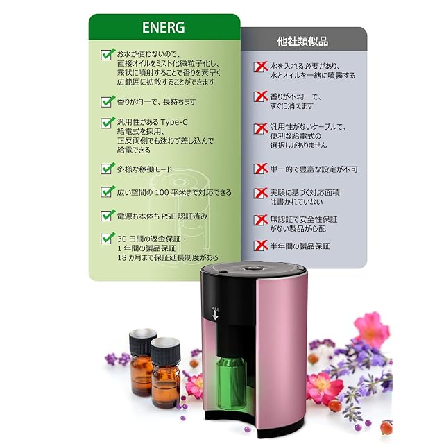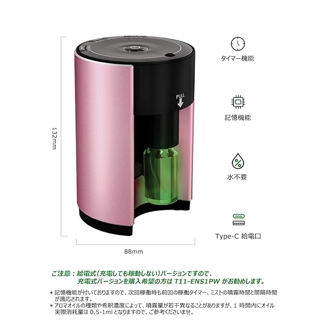 ENERG e's Explorer アロマディフューザー ネブライザー式 TYPE-C 給電式 2025 ヨガ室 ホテル 店舗 人気 タイマー機能 ノズルアダプタ2個 空瓶3個・スポイト1個付き T11-ENS1 ピンク