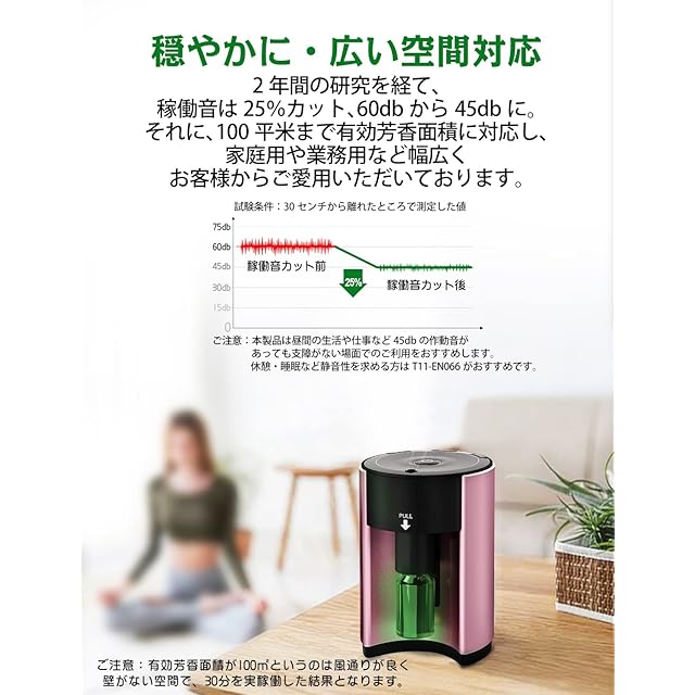 【手入れ楽々・稼動音低減デザイン】メンテナンス時、5mlのエタノールに精油瓶に入れ、本体にセットし、スイッチを押すだけで残った香りがすぐ揮発し綺麗になります。また、内部システムは低騒音稼働に設計し、お仕事、休憩、運動、睡眠の時など、最大限度にお邪魔されないように、ポンプの周りに防音材、内部の騒音発生しやすい部品接着部に防音材を採用しております。(完全な静音タイプではないので、音に敏感な方は弊社の送風式タイプのご購入はお勧めいたします。)