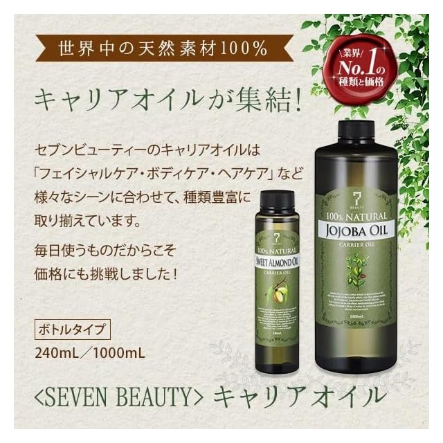 【仕様】 [ 7エステのキャリアオイルについて ] ・100%天然素材から抽出。品質にこだわり世界中から厳選した原料のみを使用。 ・品質保持の為、アルミ缶を使用。遮光性と密閉度を高めオイルの酸化を防ぐ為、ポンプボトルではなく、あえてアルミ缶を選択しました。 ・安心してお使いいただく為、防腐剤・香料・着色料・石油系界面活性剤は全て無添加。 ・多くのエステサロン様からご愛用いただいております。多用途にご使用いただけるので、ご家庭用にも大変おすすめです。 ■容量:1000ml ■精製 ■色:黄色 ■香り:ややあり ■滑り:普通 ■浸透性:ややゆっくり ■成分特徴:オレイン酸、ビタミンA・B・E ■適した肌質:敏感肌 ■使用割合:単独使用に適している ■保存/保管/期限について:キャリアオイルは開封後から酸化が進みますので、お早めに使い切ってください。