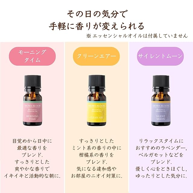 ✅精油(エッセンシャルオイル)は付属していません。お手持ちの精油ボトルに付け替えるか、付属のボトルに精油を移し替えてご使用ください。