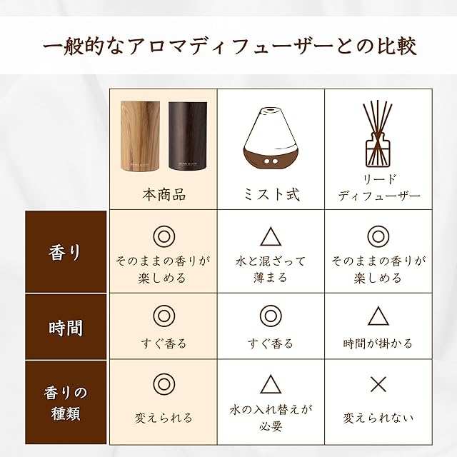 ✅【水を使わない“ネブライザー式”】精油(エッセンシャルオイル)の瓶をそのままノズルに装着し、本体に差し込むだけ。 水を使わないので、精油そのものの香りを楽しめます。