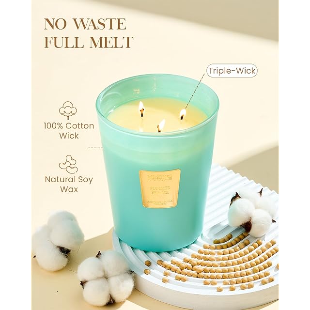 「3芯キャンドル- 均一な燃焼」- アメリカ製の鉛フリーコットンウィックを3本使用し、均一で安定した燃焼を実現します。3本のセルフトリミングコットンウィックにより、より強い香りの拡散と広い空間の雰囲気を高めます。